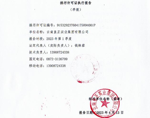 2022年云南皇正實業集團有限公司排污許可證季報 - 第四季度 2022年云南皇正實業集團有限公司排污許可證季報-第四季度