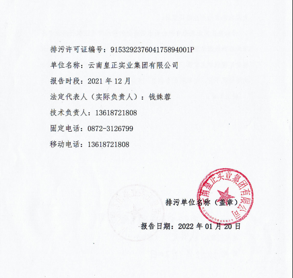 云南皇正實業集團有限公司環境信息公開表2021年度